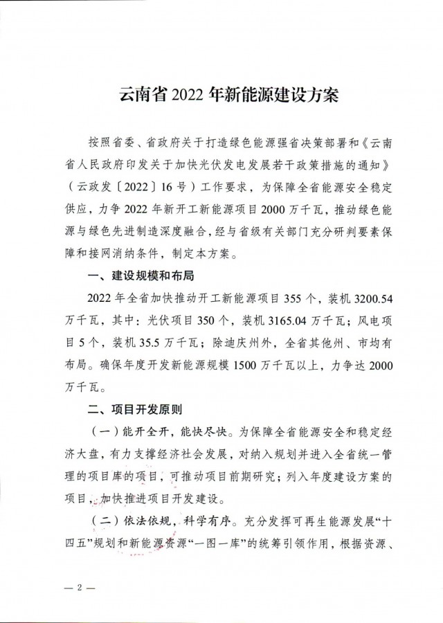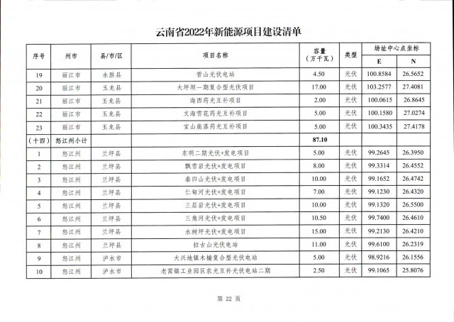 事實上,此前7月12日云南省能源局就發(fā)布了《關(guān)于征求2022年新能源建設(shè)方案》和《關(guān)于征求2022年新能源項目投產(chǎn)并網(wǎng)有關(guān)意見建議的函》,文件中云南省公示了共1702.04萬千瓦的新能源投產(chǎn)并網(wǎng)的項目清單,其中光伏975.6萬千瓦,風(fēng)電726.44萬千瓦。(點擊查看:云南17GW新能源并網(wǎng)項目清單:三峽、華能領(lǐng)銜,云南能投、華電、大唐等超1GW)此次正式下發(fā)的文件做出了一些變動。