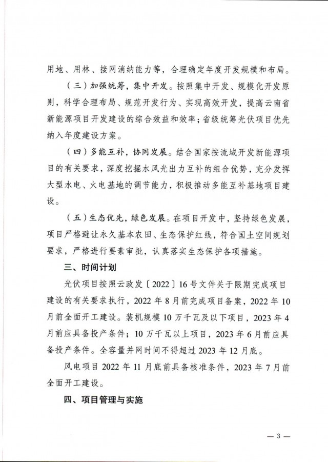 在時間計劃上,光伏項目按照2022年8月前完成項目備案,2022年10月前全面開工建設(shè)。裝機規(guī)模10萬千瓦及以下項目,2023年4月前應(yīng)具備投產(chǎn)條件;10萬千瓦以上項目,2023年6月前應(yīng)具備投產(chǎn)條件。全容量并網(wǎng)時間不得超過2023年12月底。風(fēng)電項目2022年11月底前具備核準條件,2023年7月前全面開工建設(shè)。