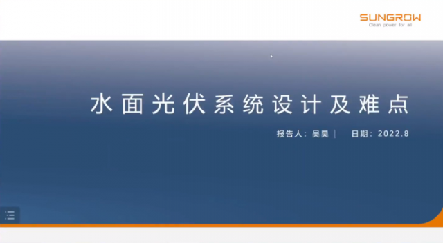 陽(yáng)光水面光伏科技有限公司產(chǎn)品中心總監(jiān)吳昊作水面漂浮系統(tǒng)技術(shù)難點(diǎn)與分析。吳總監(jiān)全面講解了水面光伏的優(yōu)勢(shì),水面光伏系統(tǒng)設(shè)計(jì)及難點(diǎn),并分享了一些典型案例經(jīng)驗(yàn)。