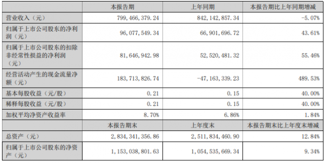 8月19日晚間,精功科技發(fā)布2022年半年度報告,報告期內(nèi),公司營業(yè)收入799,466,379.24元,同比下降5.07%,歸屬于上市公司股東的凈利潤96,077,549.34元,同比增加43.61%,詳情如下:
