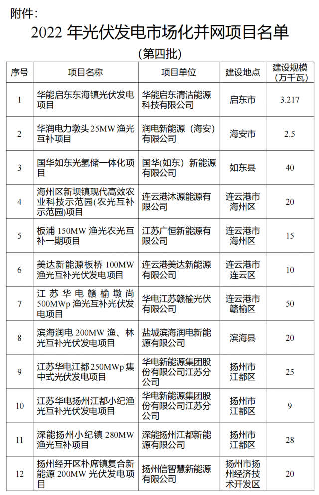 關(guān)于公布2022年光伏發(fā)電市場化并網(wǎng)項目(第四批)名單的通知