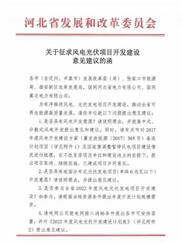 在征求意見函中,河北省發(fā)改委要求各地主管部門就風(fēng)電、地面分布式光伏開發(fā)意愿進(jìn)行說明,并請電網(wǎng)公司就電網(wǎng)接入消納條件提出各市可安排容量,并對《2022年度風(fēng)電光伏開發(fā)建設(shè)計(jì)劃表》提出意見建議。
