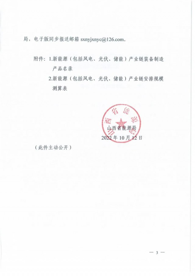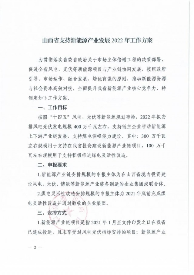 10月12日,山西省能源局印發(fā)《山西省支持新能源產(chǎn)業(yè)發(fā)展2022年工作方案》、《關(guān)于申報(bào)2022年支持新能源產(chǎn)業(yè)發(fā)展風(fēng)電光伏發(fā)電建設(shè)規(guī)模》的通知,擬先行組織產(chǎn)業(yè)鏈發(fā)展安排規(guī)模申報(bào)3GW以及1GW煤電靈活性調(diào)峰改造配套風(fēng)光項(xiàng)目。