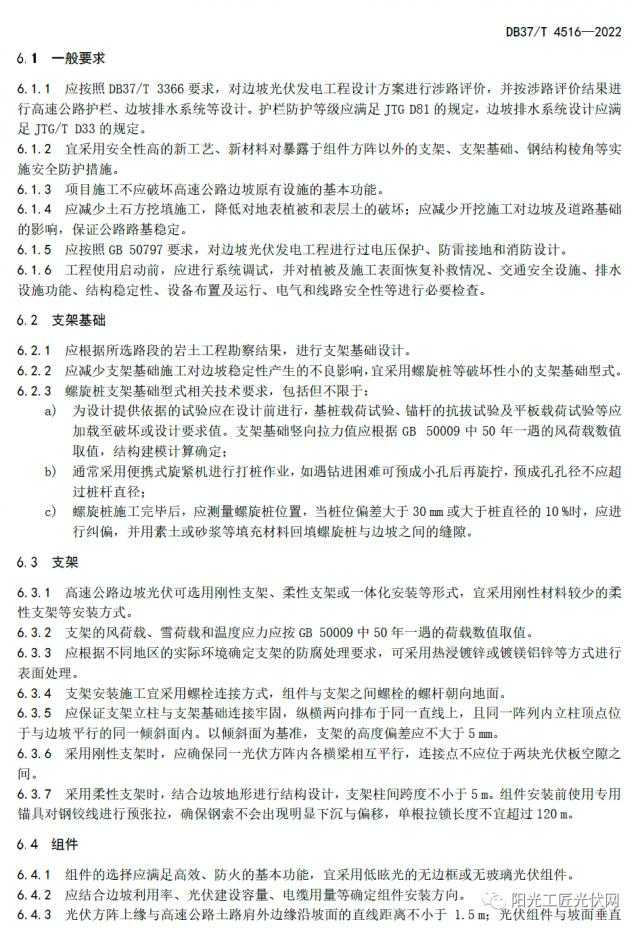本標準綜合考慮了高速公路行車對邊坡光伏的技術(shù)要求,具有安全、環(huán)保、美觀、經(jīng)濟的技術(shù)特點。在安全性上,精心選用了低反光無眩光、防火防水防腐、不易碎、具有自清潔功能的輕質(zhì)柔性光伏組件和帶有自動關(guān)斷功能的逆變器,采用柔性支架安裝,組件棱角使用柔性材料包裹,避免影響駕駛安全和二次事故傷害。在環(huán)保性上,設(shè)計了螺旋樁打孔施工技術(shù),減少對邊坡草皮的破壞。在美觀性上,注重光伏組件陣列與邊坡斜面外觀上的統(tǒng)一融合,視覺效果美觀、舒適。在經(jīng)濟性上,最大限度提高邊坡資源利用率,有利于規(guī)?;_發(fā)。