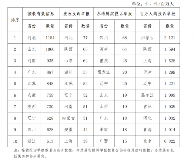 各省(自治區(qū)、直轄市)按照接收的有效信息數(shù)量排序,河北、山東、河南、廣東、江蘇、安徽、陜西、遼寧、四川、浙江排在全國前10位;按照接收的投訴舉報數(shù)量排序,河北、陜西、山東、四川、江蘇、遼寧、河南、內(nèi)蒙古、安徽、上海排在全國前10位;按照辦結(jié)屬實的投訴舉報數(shù)量排序,四川、河南、重慶、黑龍江、遼寧、山東、山西、廣東、湖南、廣西排在全國前10位;按照百萬人均投訴舉報數(shù)量排序,內(nèi)蒙古、陜西、上海、天津、遼寧、黑龍江、吉林、河北、青海、北京排在全國前10位。(2022年9月有效信息及投訴舉報排名前10位情況見表三)