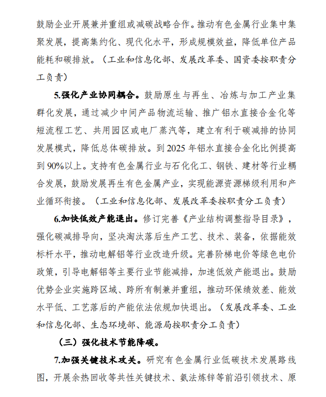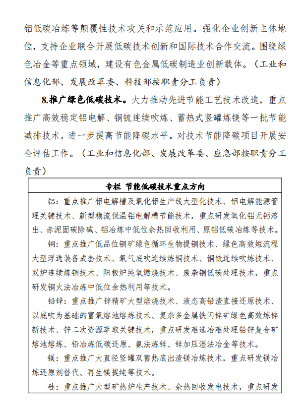 11月15日,工業(yè)和信息化部、國家發(fā)展和改革委員會和生態(tài)環(huán)境部發(fā)布《關(guān)于印發(fā)有色金屬行業(yè)碳達峰實施方案的通知》,(以下簡稱通知)通知指出,控制化石能源消費。推進有色金屬行業(yè)燃煤窯爐以電代煤,提升用能電氣化水平。在氣源有保障、氣價可承受的條件下有序推進以氣代煤。推動落后自備燃煤機組淘汰關(guān)?;虿捎们鍧嵢剂咸娲澜趪艺咴试S的領(lǐng)域以外新(擴)建燃煤自備電廠,推動電解鋁行業(yè)從使用自備電向網(wǎng)電轉(zhuǎn)化。支持企業(yè)參與光伏、風(fēng)電等可再生能源和氫能、儲能系統(tǒng)開發(fā)建設(shè)。加強企業(yè)節(jié)能管理,嚴格落實國家強制性節(jié)能標(biāo)準(zhǔn),持續(xù)開展工業(yè)節(jié)能監(jiān)察,規(guī)范企業(yè)用能行為。