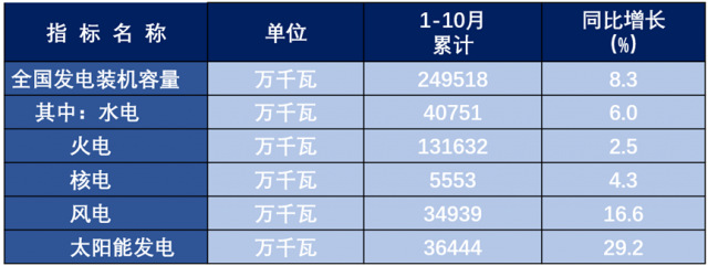 截至今年10月底,全國累計發(fā)電裝機容量約24.952億千瓦。其中,光電3.644億千瓦,風電3.494億千瓦,水電4.075億千瓦,核電0.555億千瓦,火電13.163。
