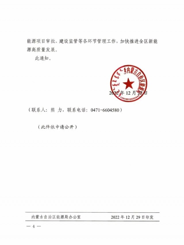 12月29日,內蒙古自治區(qū)能源局發(fā)布關于下放部分市場化并網(wǎng)新能源項目審批權限的通知,通知指出:自本文印發(fā)之日起,燃煤自備電廠可再生能源替代工程全額自發(fā)自用新能源項目和火電靈活性改造消納新能源項目由盟市能源主管部門組織評估后審批。