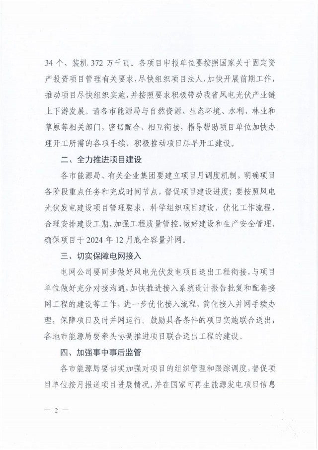 支持新能源產(chǎn)業(yè)發(fā)展項(xiàng)目34個(gè),裝機(jī)372萬(wàn)千瓦(3.72GW)。其中,光伏項(xiàng)目16個(gè),風(fēng)光一體項(xiàng)目1個(gè)(含光伏6萬(wàn)千瓦),涉及光伏項(xiàng)目共197萬(wàn)千瓦(1.97GW)。要求確保項(xiàng)目于2024年12月底全容量并網(wǎng)。