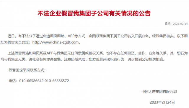 2月24日,大唐集團公告稱,有不法分子通過偽造網(wǎng)頁網(wǎng)址、APP等方式,企圖以大唐集團下屬子公司名義開展業(yè)務(wù)。以下為公告原文: