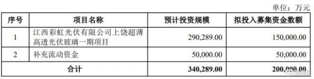 根據(jù)最新招股書(上會(huì)稿),本次發(fā)行上市,公司擬募資20億元,其中15億元用于投入“江西彩虹光伏有限公司上饒超薄高透光伏玻璃一期項(xiàng)目”、5億元用于“補(bǔ)充流動(dòng)資金”。