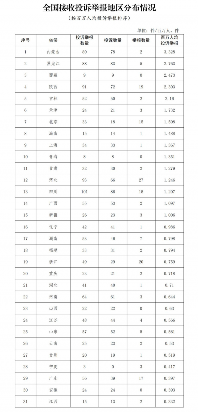 各省(自治區(qū)、直轄市)按照接收投訴舉報數量排序,四川、河北、陜西、黑龍江、內蒙古排在全國前5位。其中:按投訴數量排序,四川、黑龍江、內蒙古、陜西、河北排在全國前5位;按舉報數量排序,河北、浙江、陜西、廣東、北京(四川并列)排在全國前5位;按百萬人均投訴舉報數量排序,內蒙古、黑龍江、西藏、陜西、吉林排在全國前5位。(全國接收投訴舉報地區(qū)分布情況詳見附件1)