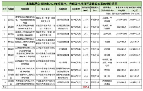 本次納入天津市2023年風(fēng)電、光伏發(fā)電項(xiàng)目共計(jì)10個(gè),規(guī)??傆?jì)2384.1MW,其中,風(fēng)電項(xiàng)目7個(gè),規(guī)??傆?jì)1528.1MW;光伏項(xiàng)目3個(gè),規(guī)??傆?jì)856MW。