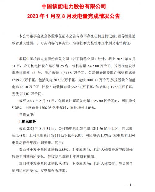 9月27日,中國(guó)核電發(fā)布公告表示,根據(jù)中國(guó)核能電力股份有限公司(以下簡(jiǎn)稱公司)統(tǒng)計(jì),截止2023年8月31日,中國(guó)核電新能源控股在運(yùn)裝機(jī)容量1509.20萬(wàn)千瓦,包括風(fēng)電507.39萬(wàn)千瓦、光伏1001.81萬(wàn)千瓦,另控股獨(dú)立儲(chǔ)能電站45.10萬(wàn)千瓦;控股在建裝機(jī)容量952.52萬(wàn)千瓦,包括風(fēng)電157.50萬(wàn)千瓦,光伏795.02萬(wàn)千瓦。截至2023年8月31日,公司累計(jì)商運(yùn)發(fā)電量1389.00億千瓦時(shí),同比增長(zhǎng)5.78%;上網(wǎng)電量1306.08億千瓦時(shí),同比增長(zhǎng)6.09%。