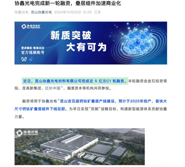 就在12月初,協(xié)鑫集團(tuán)旗下鈣鈦礦業(yè)務(wù)核心企業(yè)——昆山協(xié)鑫光電材料有限公司(下稱“協(xié)鑫光電”)宣布,公司已經(jīng)完成近5億元C1輪融資。該輪融資由金石投資領(lǐng)投,昆高新集團(tuán)、紅杉中國(guó)、瀚漾資本等機(jī)構(gòu)共同參投。光源資本擔(dān)任本輪融資獨(dú)家財(cái)務(wù)顧問(wèn)。