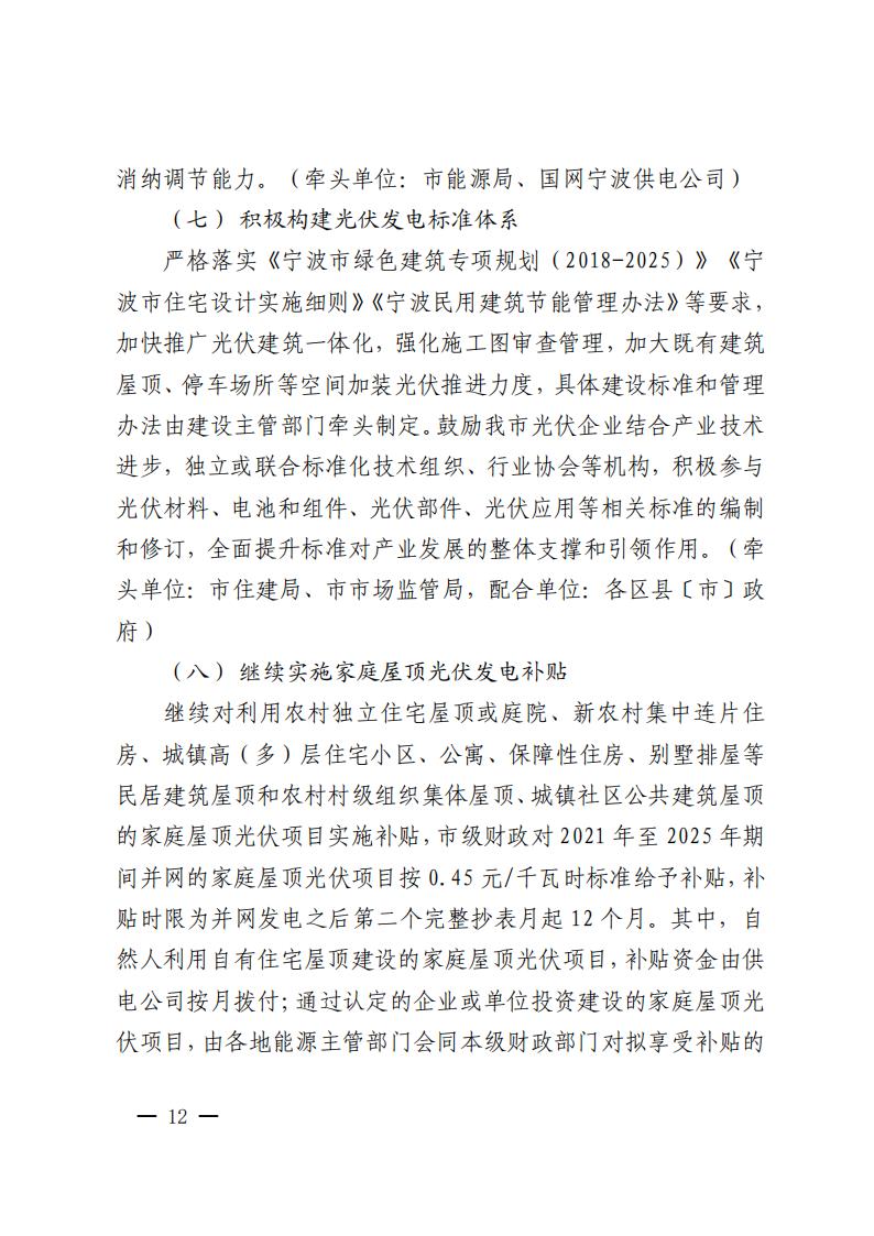 市級(jí)財(cái)政對(duì)2021年至2025年期間并網(wǎng)的家庭屋頂光伏項(xiàng)目按0.45元/千瓦時(shí)標(biāo)準(zhǔn)給予補(bǔ)貼,補(bǔ)貼時(shí)限為并網(wǎng)發(fā)電之后第二個(gè)完整抄表月起12個(gè)月。