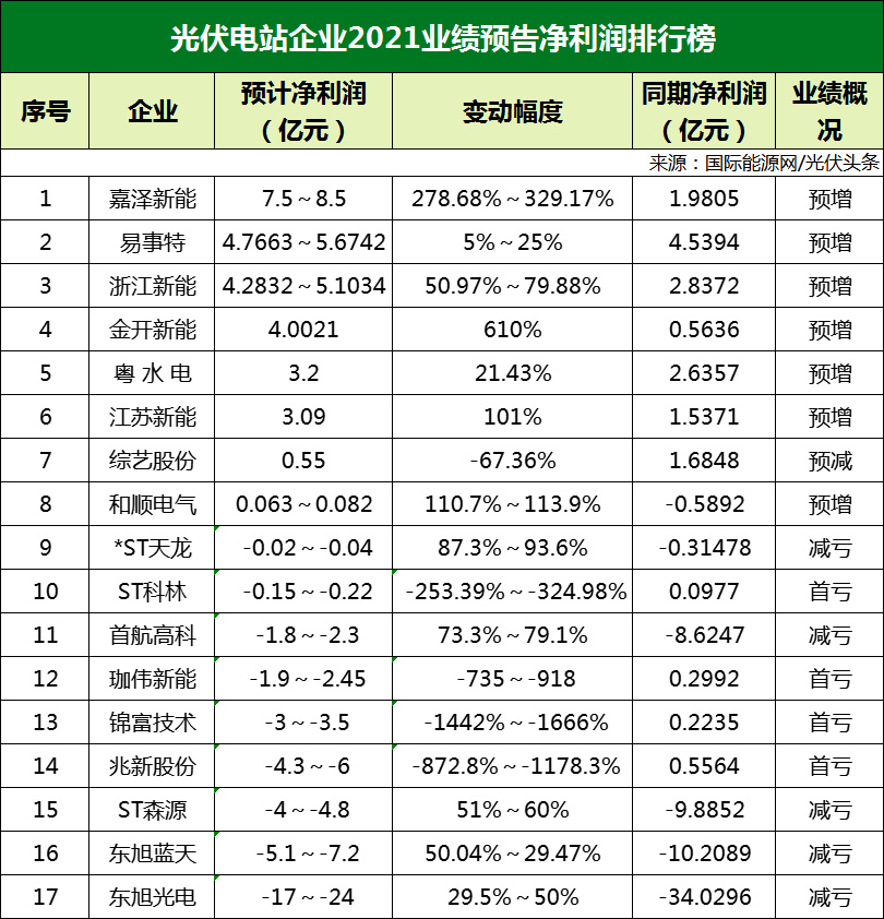 2021年由于光伏產(chǎn)業(yè)鏈上游價格暴漲,導(dǎo)致光伏產(chǎn)業(yè)鏈末端的光伏企業(yè)承受了很大壓力,光伏新增裝機不及預(yù)期。這直接反映在電站企業(yè)的財務(wù)報告中。17家與光伏電站相關(guān)的企業(yè)8家凈利潤為正值,9家處于虧損狀態(tài)。