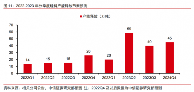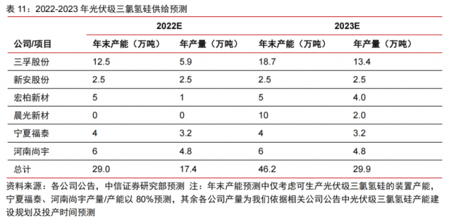 中信證券王喆在10月11日發(fā)布的研報(bào)中表示,根據(jù)2022-2023年多晶硅廠家擴(kuò)產(chǎn)計(jì)劃,2022Q4季度與2023Q2季度將迎來硅料產(chǎn)能釋放密集期,可能會(huì)存在光伏級(jí)三氯氫硅出現(xiàn)短暫的供給缺口,屆時(shí)有望提振三氯氫硅價(jià)格,預(yù)計(jì)三氯氫硅高景氣度有望維持至2023Q2。