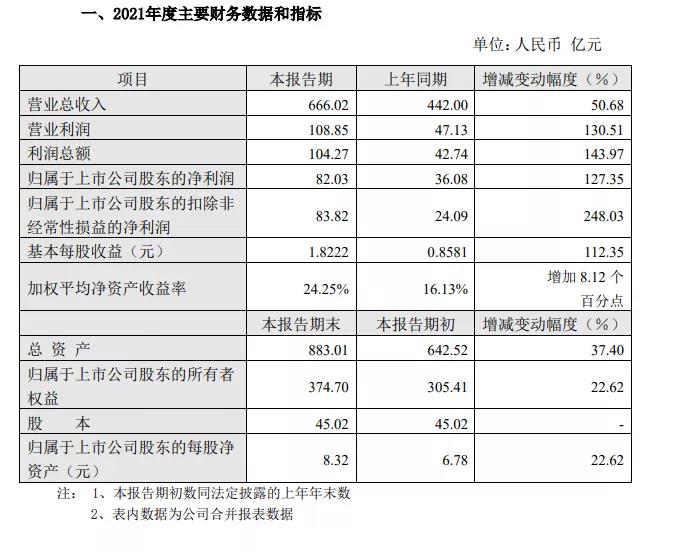 2021年末,公司總資產(chǎn)883.01億元,歸屬于上市公司股東的所有者權益374.70億元,分別較上年末增加37.4%和22.62%。