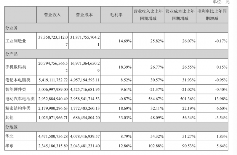 具體到欣旺達旗下各大業(yè)務(wù)分類,欣旺達的業(yè)務(wù)主要是消費電子類業(yè)務(wù)(包括手機數(shù)碼類、筆記本電腦類和智能硬件類)和汽車及動力電池類業(yè)務(wù)組成。而目前欣旺達的總體收入主要來源依然是消費電子業(yè)務(wù),2021年實現(xiàn)營業(yè)收入312.16億元,同比增長16%,占比達到83.57%,其中手機數(shù)碼類的毛利率維持在18.39%,近3年變化不大。