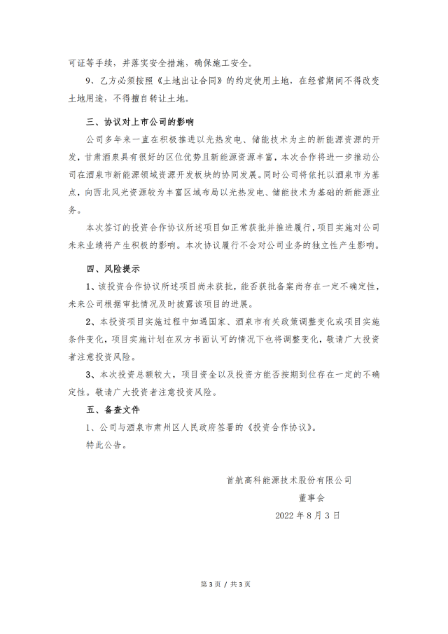 公告顯示,酒泉市肅州區(qū)人民政府在首航高科申請(qǐng)備案后,向首航高科辦理備案手續(xù),并委派專(zhuān)人協(xié)助首航高科辦理規(guī)劃、用地、水保、環(huán)保、林地、壓礦等前期工作手續(xù),以提高各項(xiàng)前期工作辦理的效率,雙方力爭(zhēng)在2023年3月30日前完成項(xiàng)目前期手續(xù)辦理。