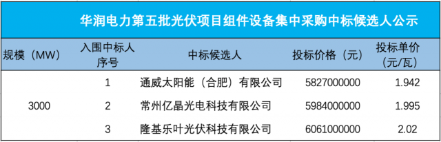 8月17日,華潤電力第五批光伏項(xiàng)目光伏組件設(shè)備集中采購中標(biāo)候選人公示,通威太陽能、億晶光電、隆基入3家企業(yè)入圍。