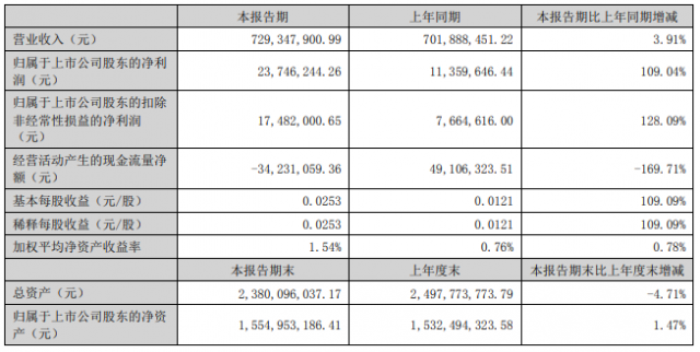 8月26日,北玻股份發(fā)布2022年上半年年度報(bào)告,報(bào)告期內(nèi),公司營業(yè)收入729,347,900.99元,同比增加3.91%,歸屬于上市公司股東的凈利潤23,746,244.26元,同比增加109.04%,詳情如下: