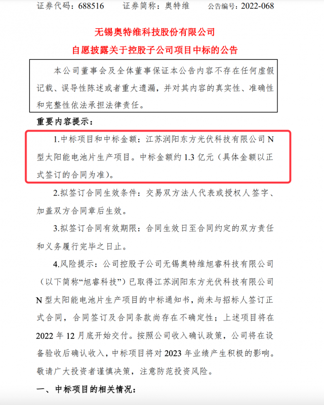 近日,奧特維公告稱,公司控股子公司無錫奧特維旭睿科技有限公司已取得江蘇潤陽東方光伏科技有限公司N型太陽能電池片生產(chǎn)項目的中標(biāo)通知書,上述項目將在2022年12月底開始交付。中標(biāo)金額約1.3億元。