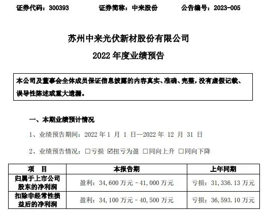 中來股份(300393)近日發(fā)布2022年年度業(yè)績預告,報告期內(nèi)歸屬于上市公司股東的凈利潤34,600萬元–41,000萬元,較上年同期扭虧為盈。