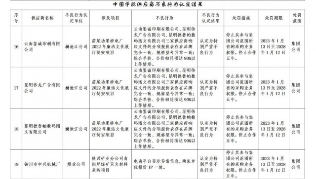 公告稱(chēng):為促進(jìn)誠(chéng)信履約,保證供應(yīng)商產(chǎn)品質(zhì)量、服務(wù)水平,依據(jù)《中國(guó)華能集團(tuán)有限公司供應(yīng)商管理辦法》的有關(guān)規(guī)定,對(duì)發(fā)生誠(chéng)信方面問(wèn)題的供應(yīng)商進(jìn)行了處理。