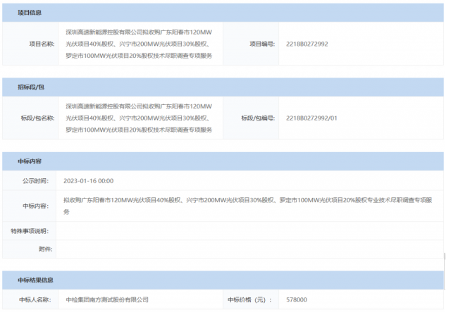 1月30日,深圳高速新能源控股有限公司公示了擬收購廣東陽春市120MW光伏項目40%股權、興寧市200MW光伏項目30%股權、羅定市100MW光伏項目20%股權技術盡職調查的中標候選人,中檢集團南方測試股份有限公司以57.8萬元的報價中標。