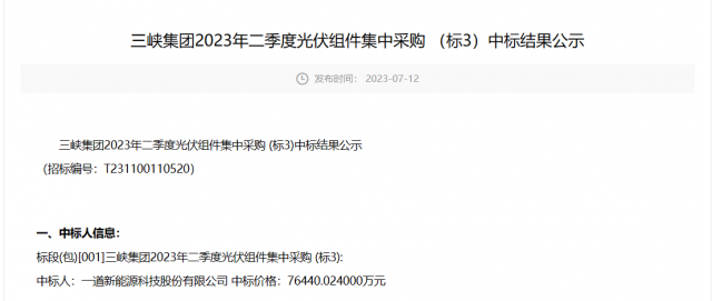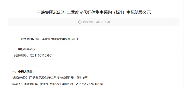 7月28日,三峽2023年二季度光伏組件集中采購(標(biāo)1)中標(biāo)結(jié)果公示,通威以1.3元/瓦的報價獨享2249.4MW的光伏組件訂單,組件型號為P型545W+雙面。