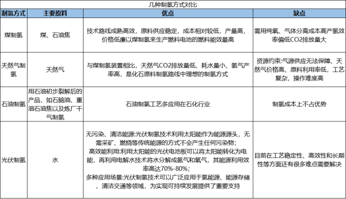 目前,商業(yè)用的氫氣中有96%是從煤、石油和天然氣等化石燃料制取而來,但傳統(tǒng)制氫仍難擺脫對(duì)化石能源的依賴。近兩年,光伏制氫技術(shù)發(fā)展勢(shì)頭漸顯,其工藝簡(jiǎn)單、無污染,被視為制氫最佳路線之一。以下為傳統(tǒng)制氫與光伏制氫方式優(yōu)缺點(diǎn)對(duì)比:
