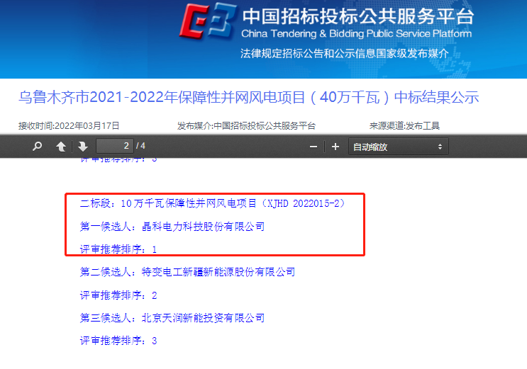 近日,烏魯木齊市2021-2022年保障性并網(wǎng)風電項目(40萬千瓦)中標結(jié)果公示,晶科科技(601778.SH)憑借領(lǐng)先的技術(shù)及良好的行業(yè)口碑,中標了其中10萬千瓦(100MW)規(guī)模的保障性并網(wǎng)風電項目。此次中標,是晶科科技成立以來首次獲得風電項目,也是公司推動可再生、清潔能源開發(fā)利用之路上新的里程碑,標志著公司正式進軍風電市場。