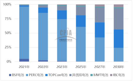 PERC技術(shù)基于其強大的性價比優(yōu)勢,以及產(chǎn)能布局,至少未來三年依舊是行業(yè)內(nèi)的主流技術(shù),各廠家也會積極提效降本來延長它的生命周期,根據(jù)CPIA的預(yù)測,到2025年,PERC電池市場占有率仍然超過50%,具體數(shù)據(jù)如圖6所示。