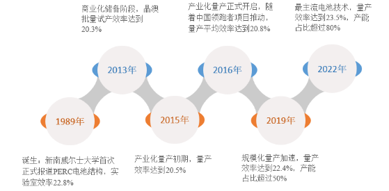一般來講,行業(yè)內(nèi)將1989年趙建華博士首次正式公布PERC電池作為該項技術(shù)的起點,但直到20多年后的2013年,通過諸多廠家與機構(gòu)長期的技術(shù)儲備和研究,PERC技術(shù)才具備了量產(chǎn)化和商業(yè)化的基礎(chǔ),并在2015年正式啟動大規(guī)模量產(chǎn),經(jīng)歷了幾次量產(chǎn)化加速的過程之后,自2019年起首次超越BSF技術(shù)成為最主流的光伏電池技術(shù)。圖1展示了PERC電池自誕生以來的幾個重要時間節(jié)點。