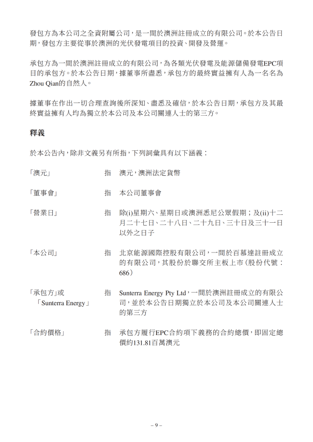 北京能源國(guó)際在公告中表示,經(jīng)考慮澳洲太陽(yáng)能發(fā)電站行業(yè)的發(fā)展及預(yù)計(jì)投資回報(bào),公司對(duì)有關(guān)行業(yè)于可見未來的前景持樂觀態(tài)度。據(jù)董事所深知,承包方為發(fā)展成熟的公司,在澳洲光伏發(fā)電項(xiàng)目建設(shè)及發(fā)展方面擁有豐富經(jīng)驗(yàn)。董事認(rèn)為,EPC合約將使公司能進(jìn)一步擴(kuò)展其業(yè)務(wù)規(guī)模,乃其實(shí)施海外發(fā)展戰(zhàn)略的具體措施。董事已審閱EPC合約并認(rèn)為其條款及條件屬公平合理,且有關(guān)合約項(xiàng)下擬進(jìn)行的交易乃按一般商業(yè)條款訂立,并符合公司及股東的整體利益。