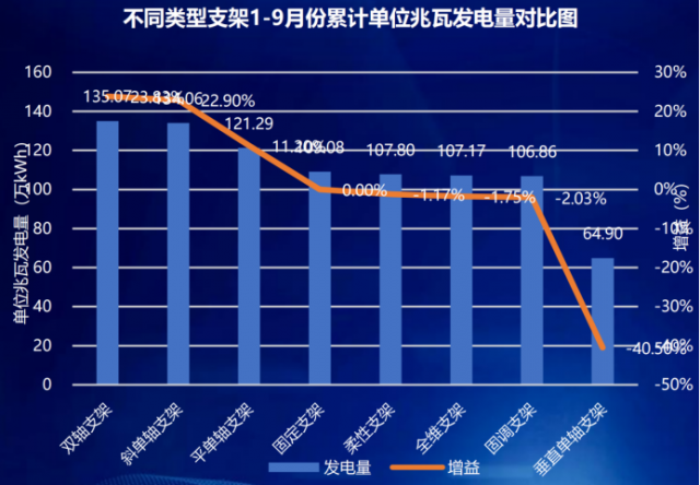 從支架實(shí)證數(shù)據(jù)分析,前三季度整體來看雙軸跟蹤系統(tǒng)發(fā)電量最高,斜單軸和平單軸次之,分別較固定支架發(fā)電量增益依次為23.83%、22.89%和11.2%;全維支架第一季度和第二季度由于支架跟蹤故障,正面輻照較低,7月份開始正常運(yùn)行后發(fā)電量明顯提高,第三季度發(fā)電量最高;另外,柔性支架總體發(fā)電量略低于固定支架,兩種柔性支架之間發(fā)電量一致性相對(duì)較差,累計(jì)發(fā)電量差1.8%。同時(shí),從實(shí)證出力曲線來看,跟蹤支架與固定支架、柔性支架相比功率曲線更加偏平,對(duì)電力系統(tǒng)更加友好。