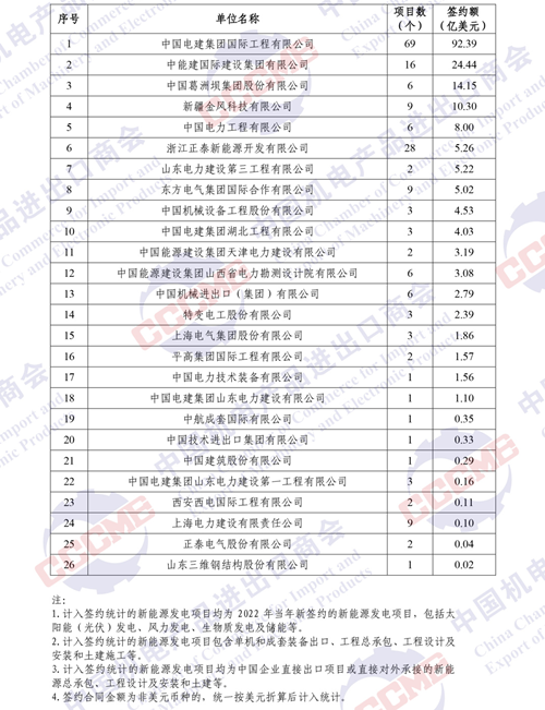 日前,中國機(jī)電產(chǎn)品進(jìn)出口商會(huì)發(fā)布2022年境外電力項(xiàng)目簽約排行榜。根據(jù)中國機(jī)電商會(huì)統(tǒng)計(jì),2022年,中國企業(yè)參與境外電力項(xiàng)目投(議)標(biāo)并最終實(shí)現(xiàn)簽約的項(xiàng)目517個(gè),簽約合同總金額339.93億美元,總裝機(jī)容量約33.5GW。根據(jù)各重點(diǎn)企業(yè)報(bào)送的2022年境外電力項(xiàng)目的新簽約情況,中國機(jī)電商會(huì)對(duì)企業(yè)簽約額進(jìn)行了排名?,F(xiàn)將企業(yè)排名及火電、水電、輸變電、新能源(太陽能、風(fēng)、生物質(zhì)、儲(chǔ)能等)及太陽能(光伏)、風(fēng)電行業(yè)簽約排名予以發(fā)布。