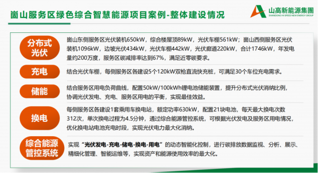 舉例來說,崮山服務(wù)案區(qū)綠色綜合智慧能源項(xiàng)目位于濟(jì)南長清區(qū)京臺(tái)高速段,占地約260 畝,其中,東側(cè)服務(wù)區(qū)較為狹長,西側(cè)服務(wù)區(qū)背靠崮 云湖,周邊旅游資源豐富,西側(cè)服務(wù)區(qū)內(nèi)已建成酒店和觀光廊道。崮山服務(wù)區(qū)年用電量約300萬度,折合年碳排放量約2653噸,服務(wù)區(qū)當(dāng)前變壓器總?cè)萘繛?500kVA。崮山服務(wù)區(qū)已建成充電樁共8個(gè)、污水處理設(shè)施、多聯(lián)機(jī)中央空調(diào)系統(tǒng)等,本次建設(shè)內(nèi)容包括分布式光伏、 儲(chǔ)能、充電站、換電站、綜合能源管理系統(tǒng)等。實(shí)現(xiàn)“光伏發(fā)電-充電-儲(chǔ)電-換電-用電”的動(dòng)態(tài)智能化控制,進(jìn)行碳排放數(shù)據(jù)監(jiān)視、分析、展示、精細(xì)化管理、智能運(yùn)維等,實(shí)現(xiàn)資產(chǎn)和能源使用效率的最大化。