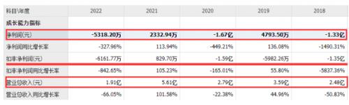 可以看到,在近五年里,該公司扣非凈利潤除2021年稍有盈余以外,基本年份都處于虧損狀態(tài),而2021年?duì)I收也達(dá)到近5年新高。然而到2022年又迅速大跌至1.91億元的同期低谷。業(yè)績“坐過山車”也讓該公司備受資本市場的質(zhì)疑。