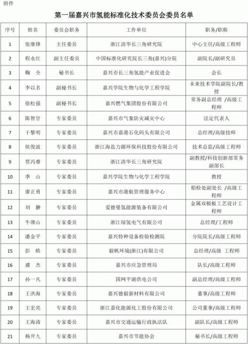 附件:第一屆嘉興市氫能標準化技術委員會委員名單