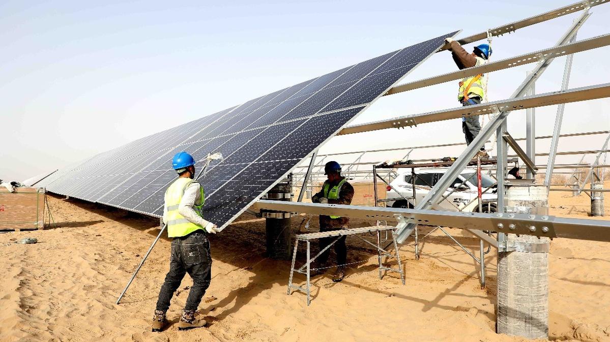 記者在35萬千瓦新增負(fù)荷消納光伏發(fā)電項(xiàng)目建設(shè)現(xiàn)場(chǎng)看到,一排排光伏板連線成片,宛如藍(lán)色的海洋,向戈壁深處不斷延伸,呈現(xiàn)出一派蓬勃發(fā)展的新氣象。項(xiàng)目業(yè)主單位和建設(shè)單位全力組織技術(shù)人員和工人,按照一季度項(xiàng)目施工進(jìn)度計(jì)劃,分片區(qū)、分方陣進(jìn)行光伏支架和光伏組件安裝。目前,110個(gè)發(fā)電方陣、67萬塊組件以及相關(guān)設(shè)施的施工正有序進(jìn)行中。