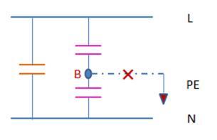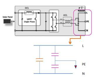 上圖中,L-PE以及N-PE間的電容被稱為Y電容,L-N間的電容被稱為X電容,X電容與Y電容也被叫做安全電容。做此設(shè)計(jì)的出發(fā)點(diǎn),就是利用電容隔直通交的特性,把外界干擾和內(nèi)部產(chǎn)生的一些高頻輻射,通過電容——地線的路徑進(jìn)行濾除,從而增加逆變器的電磁兼容性。