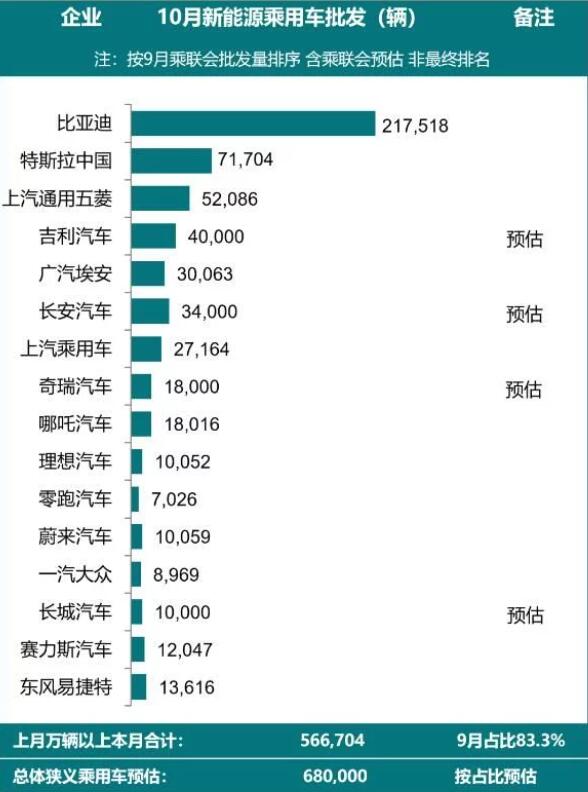 乘聯(lián)會(huì)指出,考慮到主力企業(yè)中的個(gè)別企業(yè)10月減量因素與增量因素的平衡,10月主力企業(yè)占比較上月主力企業(yè)(萬(wàn)輛以上)保持基本穩(wěn)定,因此預(yù)估10月乘聯(lián)會(huì)新能源乘用車(chē)廠商批發(fā)銷(xiāo)量68萬(wàn)輛,環(huán)比9月增1%,同比去年10月增長(zhǎng)約87%。