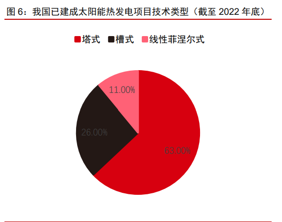 我國已建成光熱項(xiàng)目中,塔式光熱占比相對較高。根據(jù) CSTA 數(shù)據(jù),截至 2021 年底, 全球太陽能熱發(fā)電累計(jì)裝機(jī)容量達(dá)到 6.8GW,槽式、塔式、線性菲涅耳技術(shù)裝機(jī)在全球主 要國家和地區(qū)的占比為 76%、20%和 4%。截至 2022 年底,我國太陽能熱發(fā)電累計(jì)裝機(jī) 容量為 588MW(含 MW 級以上規(guī)模的發(fā)電系統(tǒng)),塔式光熱電站雖然前期系統(tǒng)建設(shè)一次性投資較大且維護(hù)成本較高,但更適合我國西部地區(qū)晝夜溫差大、缺少水資源、自然環(huán)境 惡劣等特點(diǎn),同時因槽式系統(tǒng)和線菲式系統(tǒng)集熱效率偏低、對工質(zhì)加熱能力較弱等因素, 因而在我國塔式光熱電站應(yīng)用范圍相對較廣。