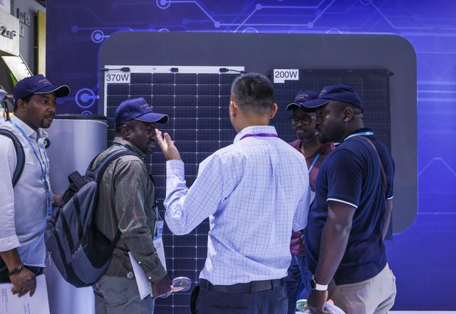 4月15日,參展商在第135屆廣交會(huì)上向采購(gòu)商介紹太陽能電池組件展品。新華社記者劉大偉攝