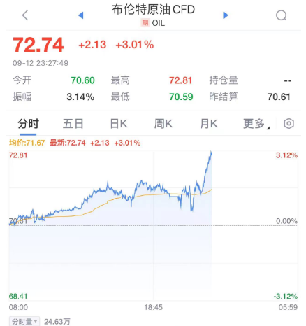 美東時(shí)間9月12日,國(guó)際油價(jià)暴漲,WTI原油日內(nèi)漲超3.5%,布倫特原油漲超3%。