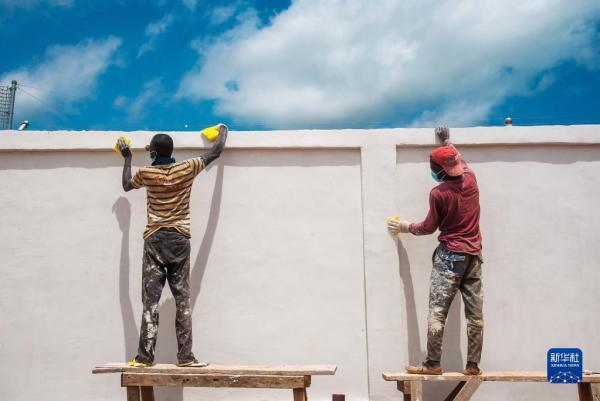 6月2日,在中非共和國首都班吉附近的賓博市,薩卡伊光伏電站的當?shù)貑T工在粉刷墻壁。新華社記者羅毓攝