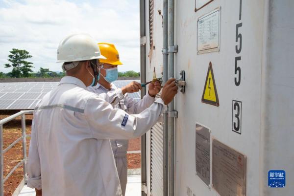 6月2日,在中非共和國首都班吉附近的賓博市,工程師在薩卡伊光伏電站檢修設備。新華社記者羅毓攝